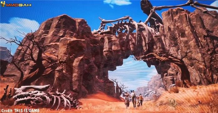 The event featured an exclusive Blade and Soul 2 teaser showcasing a visually striking western desert landscape populated with enormous dragon and dinosaur skeletons. This environmental design suggests a departure from traditional Asian-inspired settings, potentially indicating expanded world-building and new geographical regions to explore. The brief cinematic focuses on a small adventuring party navigating under a massive stone arch, highlighting potential party-based gameplay mechanics.