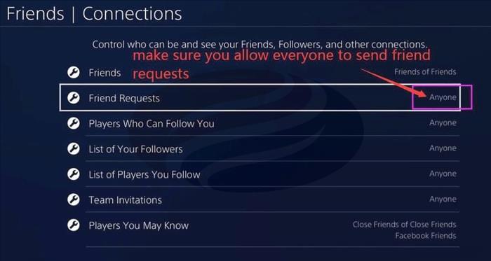- PS4 users must set friend requests to ‘Anyone’ in privacy settings