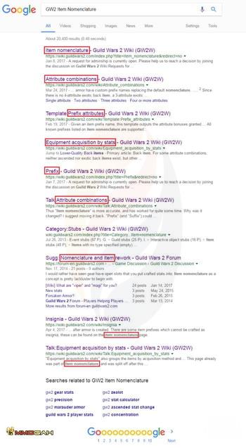 “Nomenclature is a system of names or terms, or the rules for forming these terms in a particular field of arts or sciences. Nomenclature is the system of assignment of names given to organic compounds.” This systematic approach to naming directly correlates with how GW2 organizes its attribute combinations.