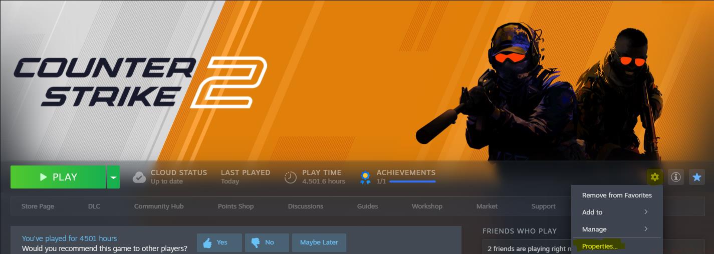 Begin by accessing your Steam Library and locating Counter-Strike 2 in your games list. Identify the gear-shaped settings icon positioned on the right side of the interface and select ‘Properties’ from the dropdown menu that appears.