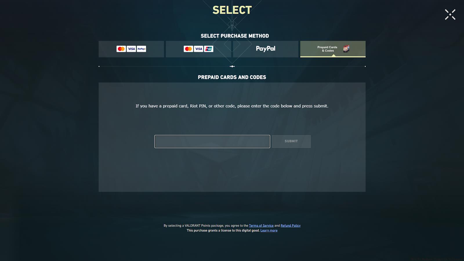 - Redeem codes via the VP icon in Valorant’s top-right menu under ‘Prepaid Cards and Codes’