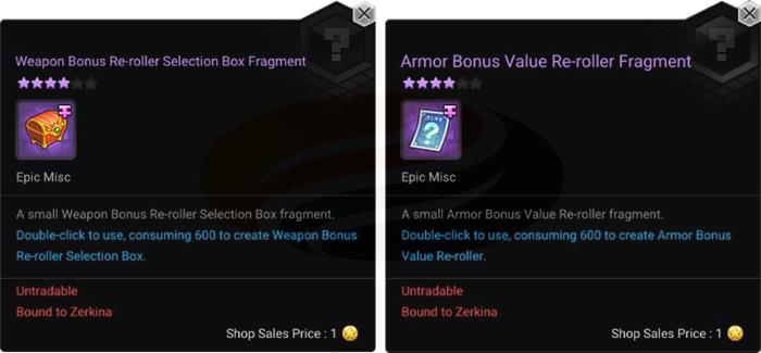 Bonus Value Re-Rollers offer more targeted optimization, allowing players to re-roll only the numerical values of existing bonus stats. This specialized tool requires 6 dungeon completions to obtain fragments for an Epic Armor Bonus Value Re-roller.