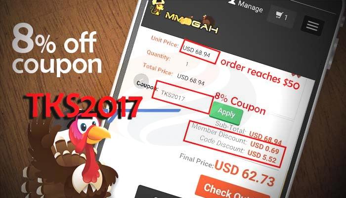 No reproduction without permission:OnLineGames Guides » MmoGah Thanksgiving Sales 2017: 8% Off Coupon for Orders of $50+ Complete guide to MmoGah's Thanksgiving 2017 promotion with exclusive 8% discount and shopping strategies