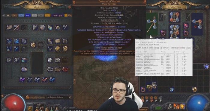 The subsequent valuable feature involves integrated price assessment functionality. Default activation utilizes Ctrl D combination. Command execution initiates automated PoE trade searches followed by results display within pop-up interface. Listing age information appears alongside temporal data, revealing for instance one Doryani’s Catalyst listing active for 2 hours duration. Priced at 1.5 exalted orbs with supplementary chaos orb valuations.