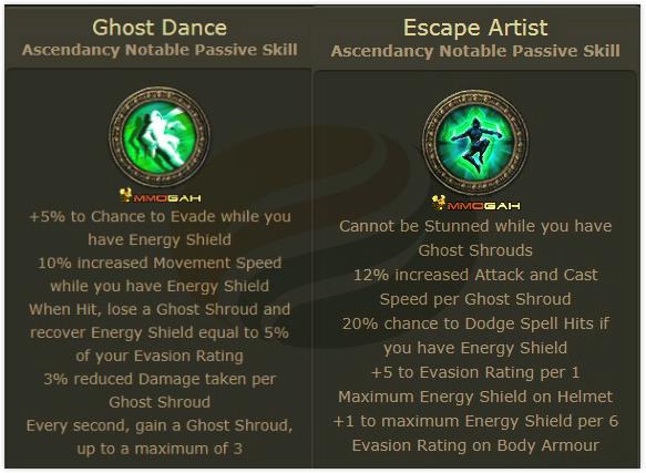 Ghost Dance provides exceptional defensive capabilities by converting evasion into additional energy shield recovery, while Escape Artist synergizes beautifully by scaling both evasion and energy shield based on your equipped items.