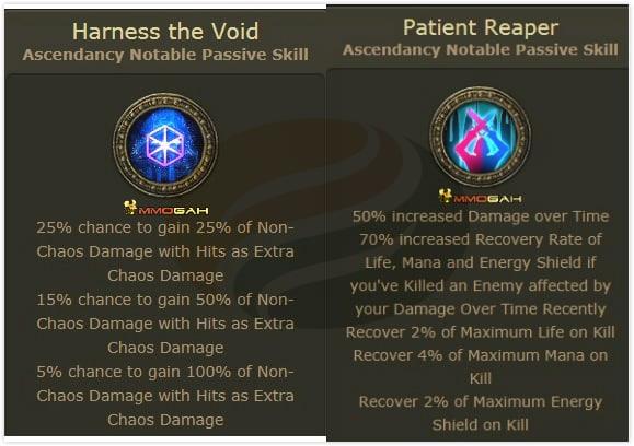 Harness the Void introduces random chaos damage conversion that can dramatically increase burst damage potential, while Patient Reaper provides essential sustain through life and mana recovery on kill.
