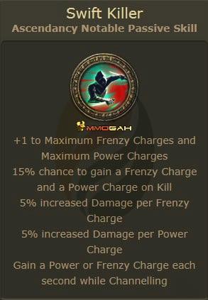 The Swift Killer ascendancy node provides critical benefits for channeling skill users, offering power charge generation and duration extension that significantly enhances critical strike capabilities.