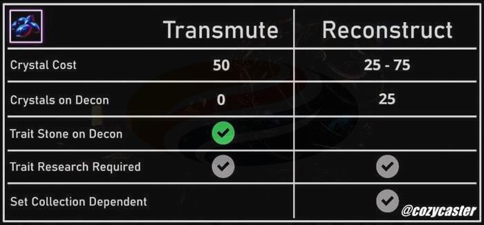 1TL;DR Transmutation lets you modify gear traits or recreate collected set pieces using Transmute Crystals Reconstruction costs decrease from 75 to 25 crystals as you collect more s...